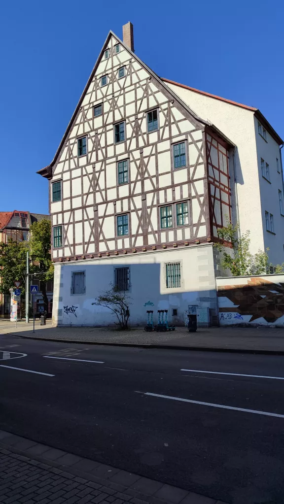 Die Kaufleute passierten die Kaufmannskirche am Ausgang des Angers, die mit ihrem Namen an die Lage an der Handelsstraße erinnert, ließen vielleicht die Meienbergstraße links liegen und bogen ab in die Johannesstraße und zwar genau am Haus 178, Zum Grünen Sittich und Gekrönten Hecht. Dieses Haus ist fast 700 Jahre alt. Im 14. Jahrhundert gehörte es Theodor von Lublin, einer der großen Erfurter Familien entstammend, und reich geworden war auch er durch den Fernhandel.